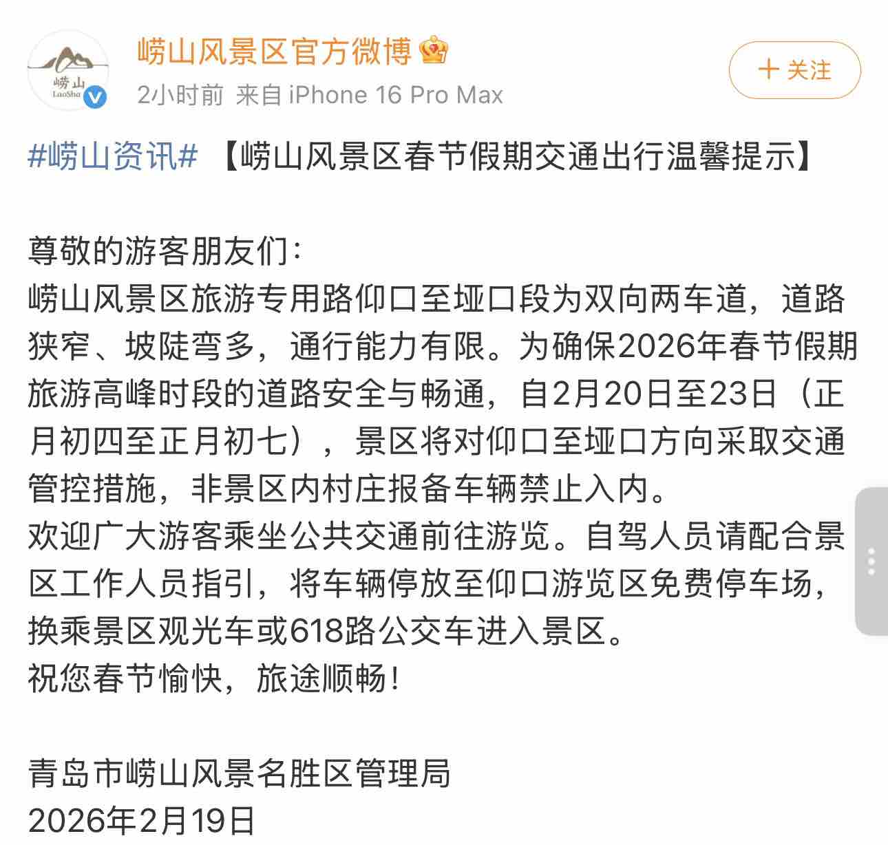 嶗山風景區旅游專用路仰口至埡口段為雙向兩車道,道路狹窄、坡陡彎多,通行能力有限。為確保2026年春節假期旅游高峰時段的道路安全與暢通,自2月20日至23日(正月初四至正月初七),景區將對仰口至埡口方向采取交通管控措施,非景區內村莊報備車輛禁止入內。