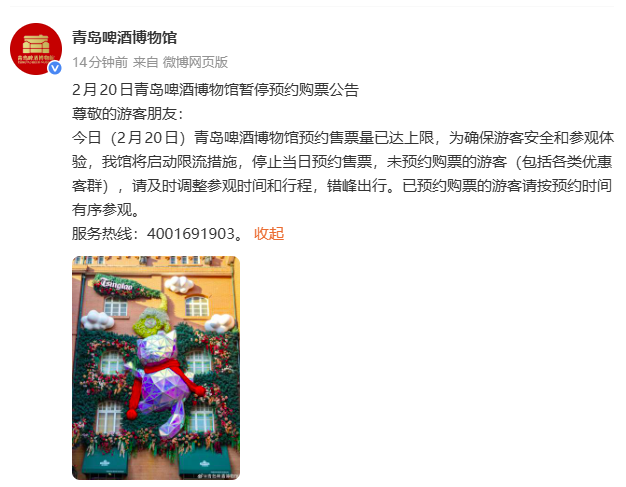 啟動限流,青島啤酒博物館20日暫停預約購票 2026-02-20 13:44 0 2月20日,記者從青島啤酒博物館官方微博獲悉,為確保游客安全和參觀體驗,當日啟動限流措施。 根據公告,2月20日青島啤酒博物館預約售票量已達上限,為確保游客安全和參觀體驗,將啟動限流措施,停止當日預約售票,未預約購票的游客(包括各類優惠客群),請及時調整參觀時間和行程,錯峰出行。已預約購票的游客請按預約時間有序參觀。服務熱線:4001691903。 青島財經日報/首頁新聞記者 李賽男