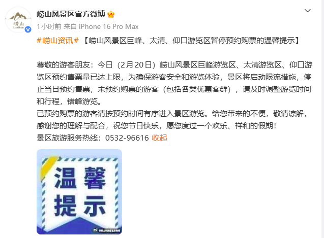 周知!嶗山風景區巨峰、太清、仰口20日預約售票量已達上限 2026-02-20 13:48 0 2月20日,記者從嶗山風景區官方微博獲悉,今日(2月20日)嶗山風景區巨峰游覽區、太清游覽區、仰口游覽區預約售票量已達上限,為確保游客安全和游覽體驗,景區將啟動限流措施,停止當日預約售票,未預約購票的游客(包括各類優惠客群),請及時調整游覽時間和行程,錯峰游覽。已預約購票的游客請按預約時間有序進入景區游覽。景區旅游服務熱線:0532-96616 青島財經日報/首頁新聞記者 李賽男