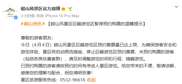 售票量已達上限!嶗山風景區巨峰游覽區4月4日暫停預約購票 2026-04-04 11:43 0 嶗山風景區巨峰游覽區暫停預約購票的溫馨提示 尊敬的游客朋友: 今日(4月4日)嶗山風景區巨峰游覽區預約售票量已達上限,為確保游客安全和游覽體驗,景區將啟動限流措施,停止巨峰游覽區預約售票,未預約購票的游客(包括各類優惠客群),請及時調整游覽時間和行程,錯峰游覽。 已預約購票的游客請按預約時間有序進入景區游覽。給您帶來的不便,敬請諒解,感謝您的理解與配合,祝您清明安康! 景區旅游服務熱線:0532-96616 來源:嶗山風景區官方微博 責任編輯:李賽男