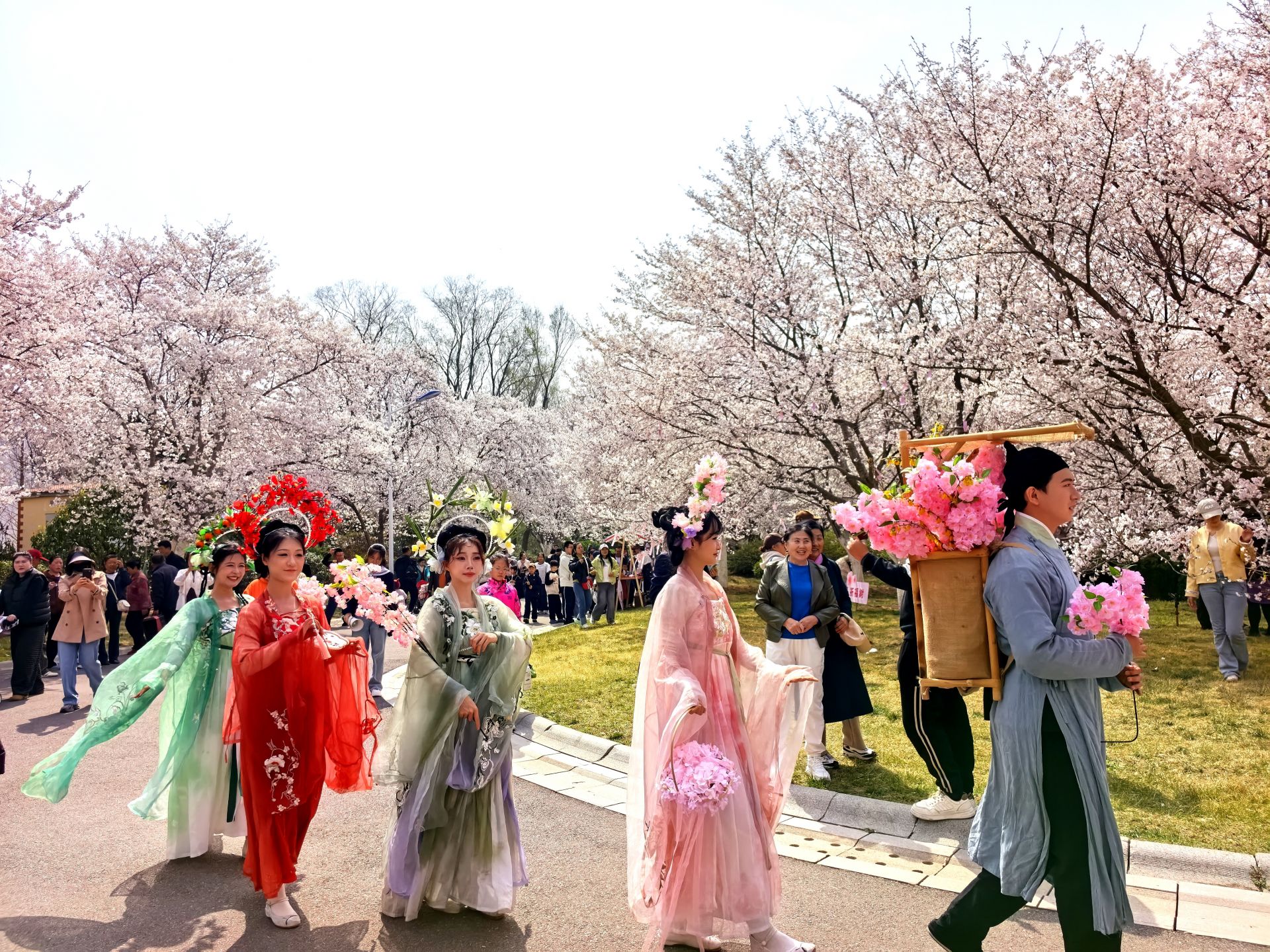 櫻花節配套主題活動同樣亮點紛呈、人氣爆棚。“硬核坦克快閃與溫柔櫻花花海碰撞,反差感十足,太出片了!”在坦克快閃車展區,來自濰坊的游客李凱正在打卡拍照,解鎖春日新潮體驗。不遠處,身著古風服飾的簪花郎巡游隊伍緩步而行,頭戴繁花、衣袂翩翩,與櫻花景致相得益彰,成為林間一道流動的風景線;祈福樹前,游客們提筆寫下心愿牌,將春日期許與美好祝福系于枝頭,寄托對生活的熱愛。據青島源誠畫美達尼旅游發展有限公司總經理生杰介紹,假期期間園區日均接待游客近3萬人次,賞櫻觀光與互動體驗深度結合,讓游客沉浸式感受春日鄉村的獨特魅力。