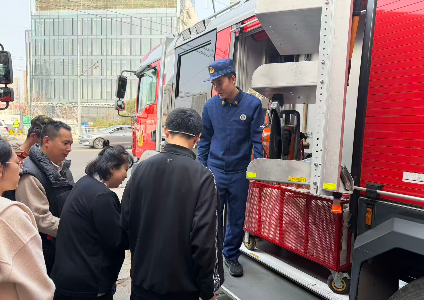 當天,消防員帶領居民參觀各類消防車輛與救援裝備,詳細介紹水罐消防車、搶險救援車的功能用途,以及破拆工具組、空氣呼吸器、消防水帶、水槍等專業器材的名稱、作用與使用場景。居民們認真聆聽、積極提問,消防員現場演示器材操作方法,讓大家對滅火救援工作有了直觀、清晰的認識。